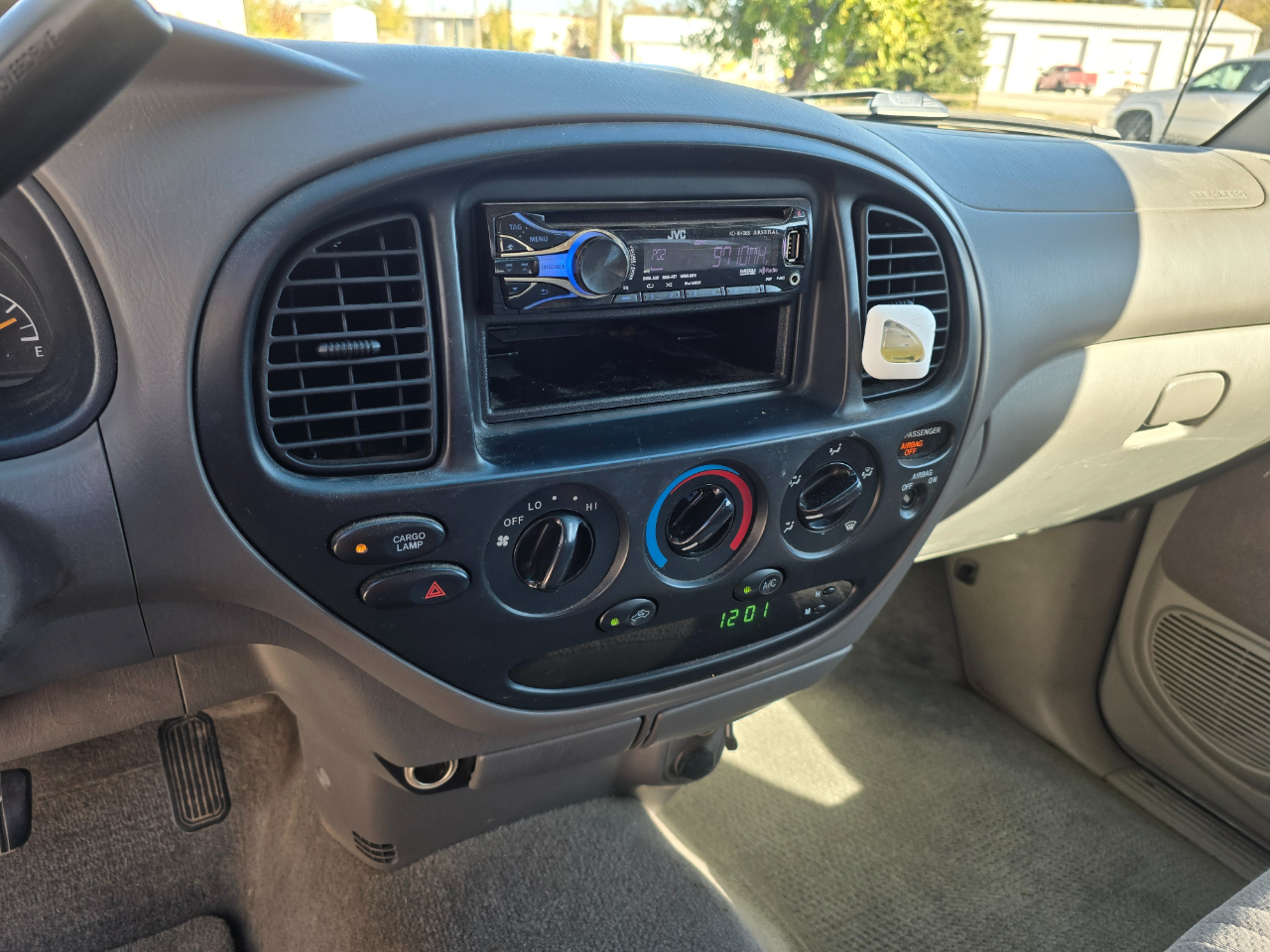Great running and driving V8 Tundra! Frame is solid (photo), ICE cold air/hot heat, power windows and door locks. Manual rear sliding window, manual pop-out rear door windows, aftermarket JVC radio with CD player/AUX capability. Beautiful cloth interior, good rear tires (photo), ok front tires, tow package, plastic insert bedliner.
